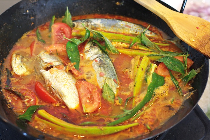 Then you add the fish, toss in the okra and tomatoes and other vegetables and herbs, and pour in the tamarind juice for that contrasting sourish-sweetness flavor. Finally, stir in coconut milk to give it body and richness.