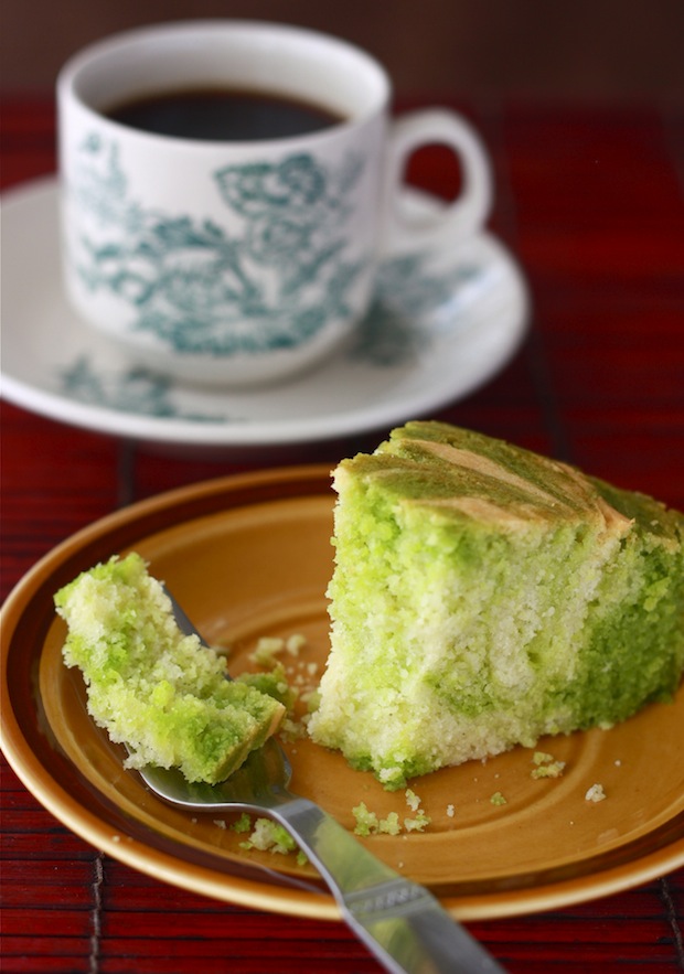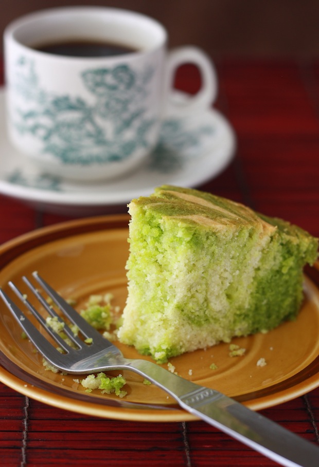 - My pandan marble cake cracked quite a bit on top. To help prevent cracking (even though it does make the cake look more appetizing), keep in mind my mistakes: