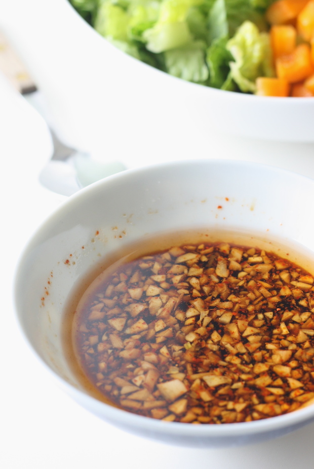 For the dressing, combine vegetable oil with more honey and soy sauce. Stir in some rice vinegar and toasted sesame oil, and a generous amount of freshly chopped garlic, to create a balance of savory, sweet flavors. Then sprinkle in Japanese Chili Flakes to spice it up.